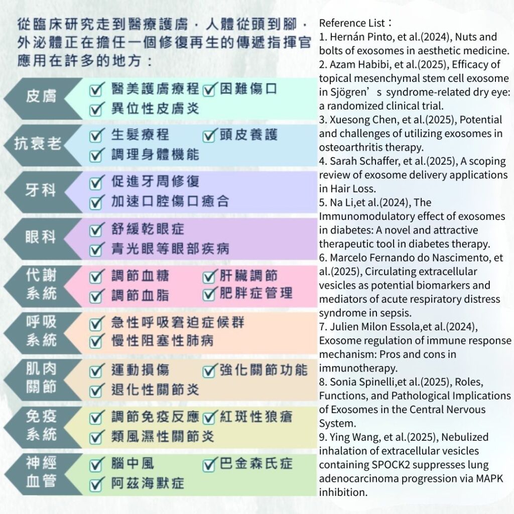 根據研究顯示,人源外泌體可以應用在許多方面,比如抗衰老保養、關節修護、乾眼症治療、生髮療程等等。一曜再生目前生產的人源外泌體用於研究,但對未來的新藥應用發展深具信心,目前有多項產學合作的實驗,均與外泌體相關,希望未來可用外泌體,幫助人類克服健康問題。許多的研究都證明外泌體的有效性: